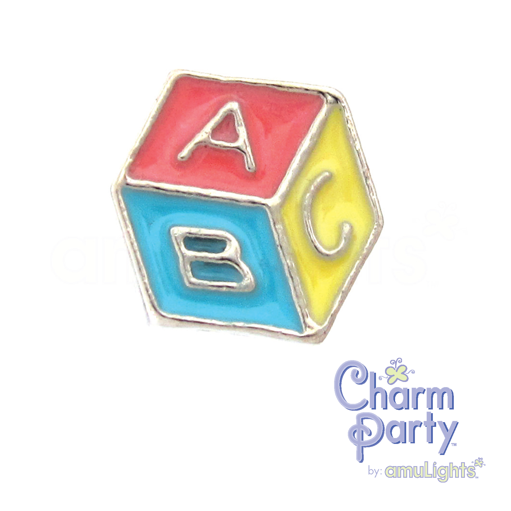 ABC Block Charm to place in a locket. Alloy and enamel.